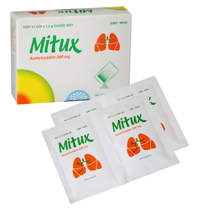 Mitux với thành phần chính là Acetylcystein là một chất làm loãng chất nhầy, tác dộng trên giai đoạn gel của chất nhầy bằng cách cắt đứt cầu nối disulfua của các glycoprotein. Thuốc được dùng làm giảm độ quánh của đờm ở phổi tạo thuận lợi cho