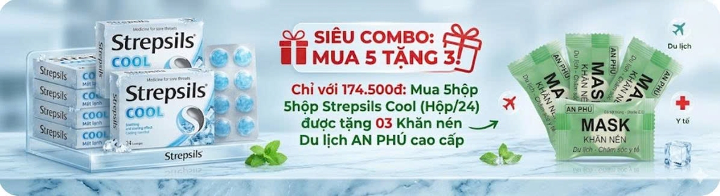 Mua 5hộp strepsils cool (hộp/24) = 174.500đ được tặng 03 khăn nén du lịch an phú